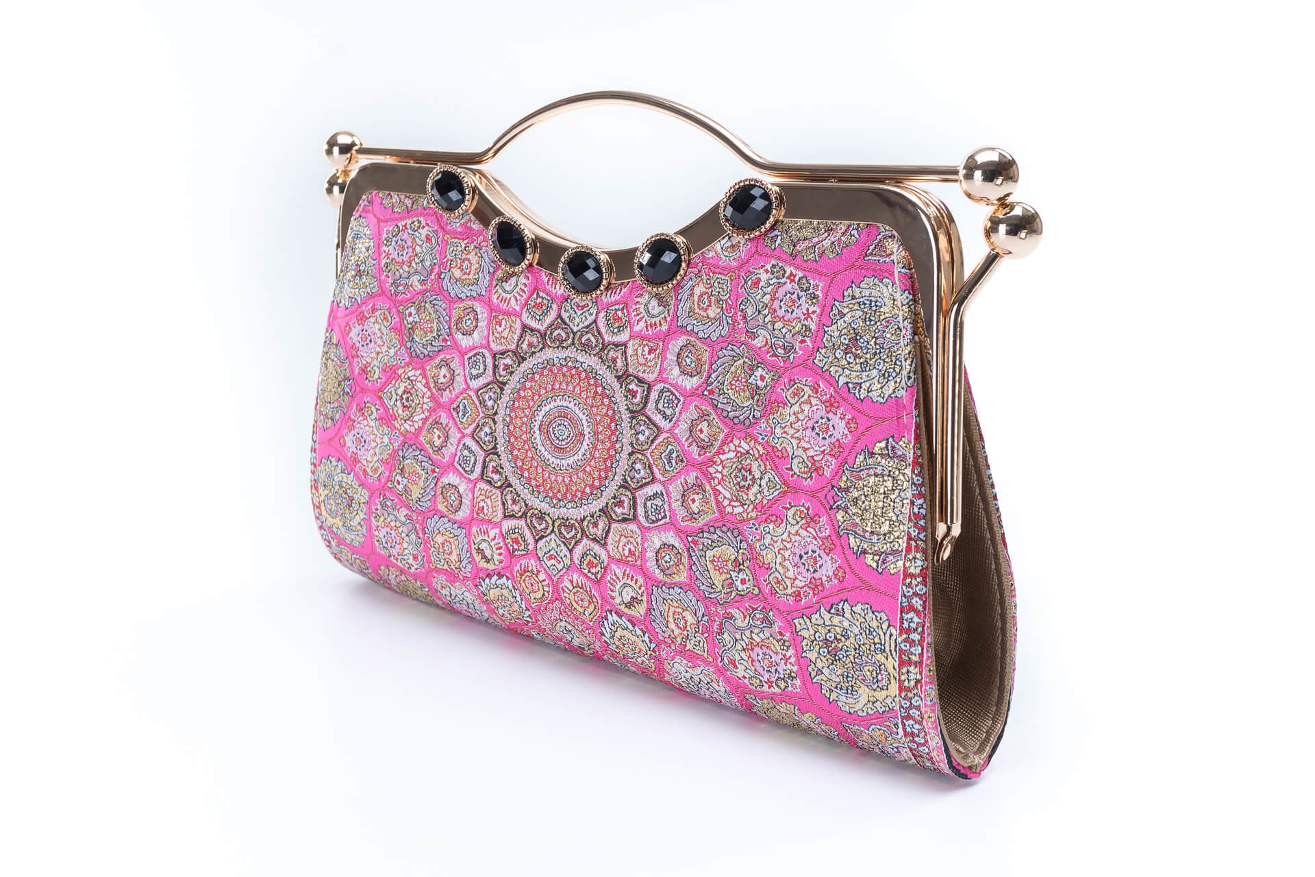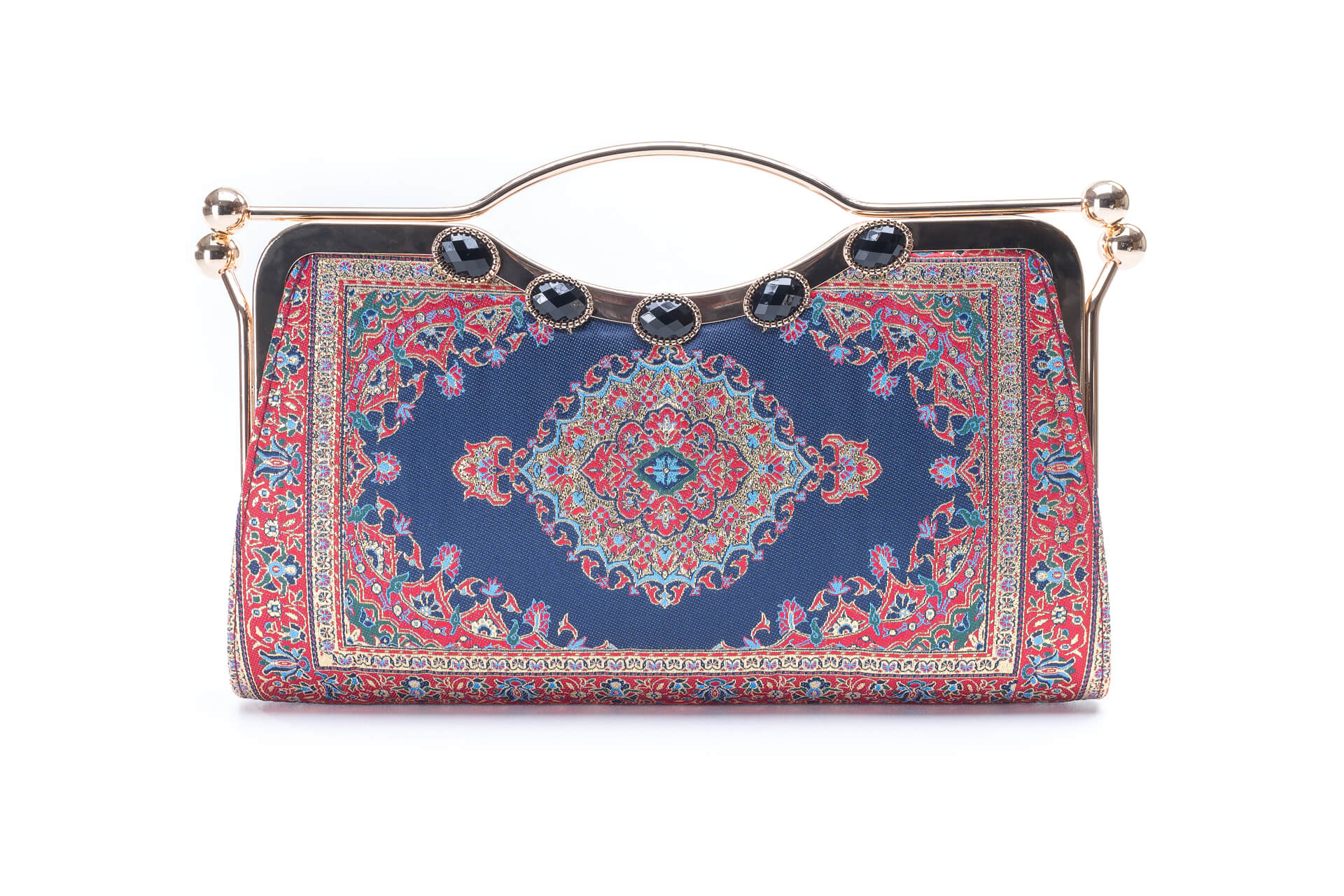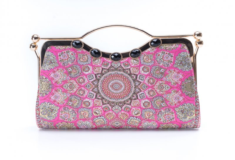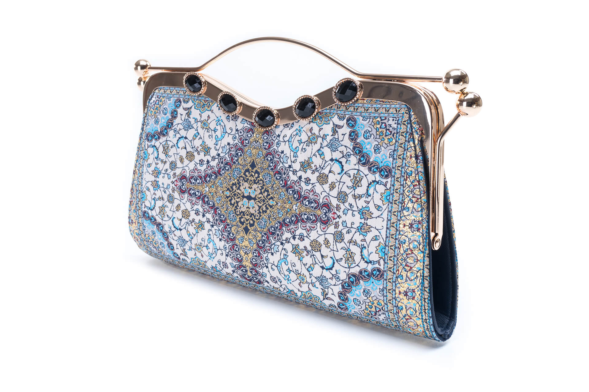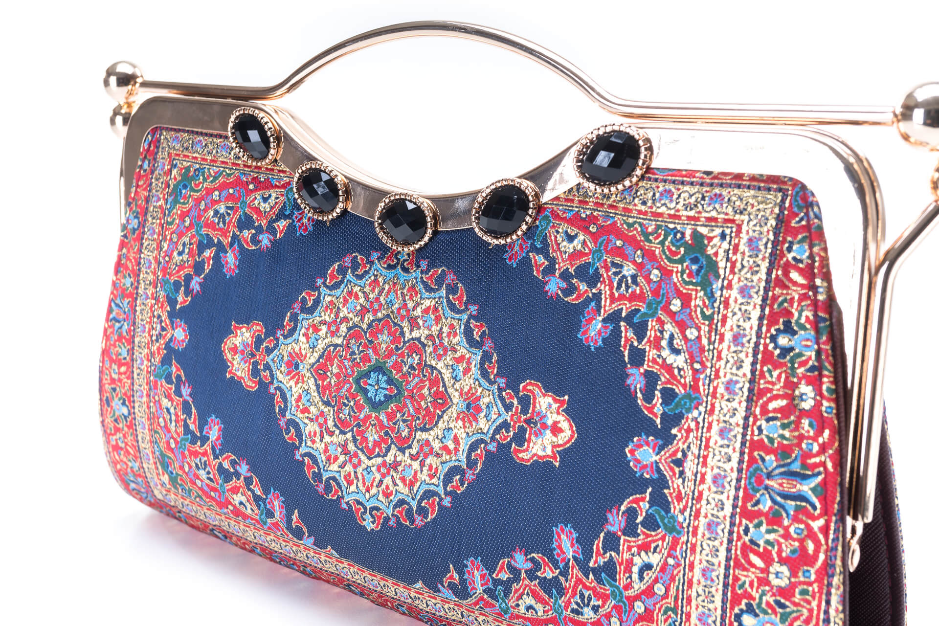 Özellikleri: Taşlı, topuzlu çıtlı kapak, dokuma simli, sarı yaldızlı iç astar, fermuarlı iç cep