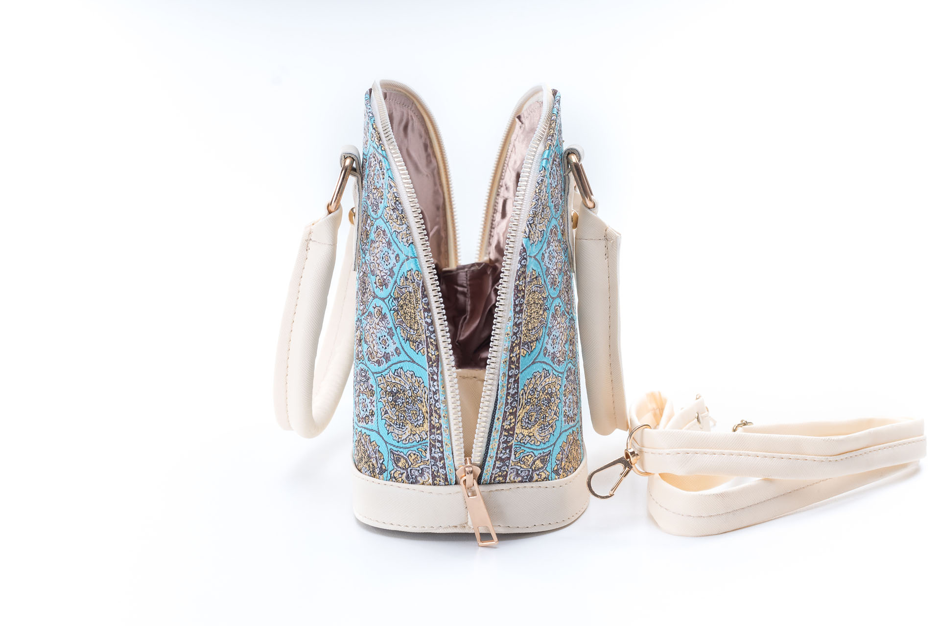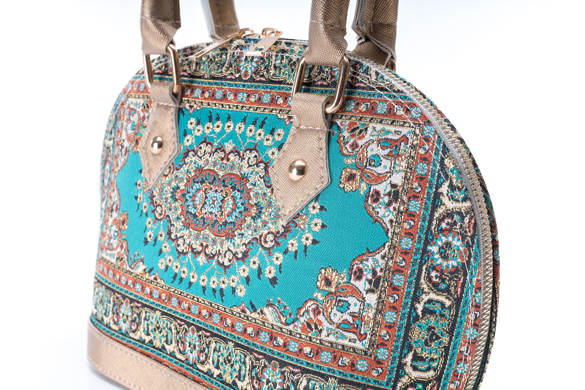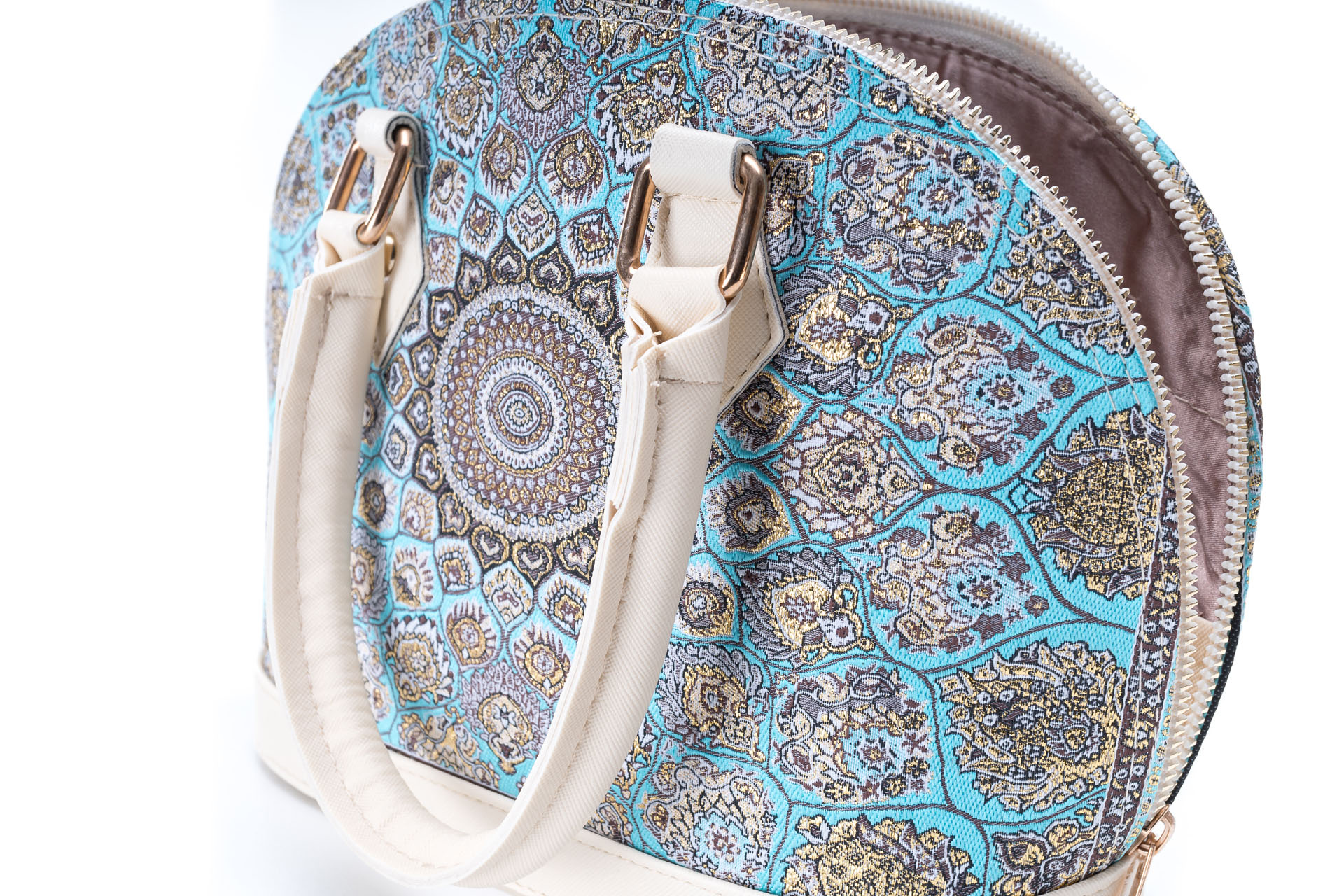 Özellikleri: Kulplu, çift fermuarlı kapak, dokuma simli, iç astar, süet deri, fermuarlı iç cep.