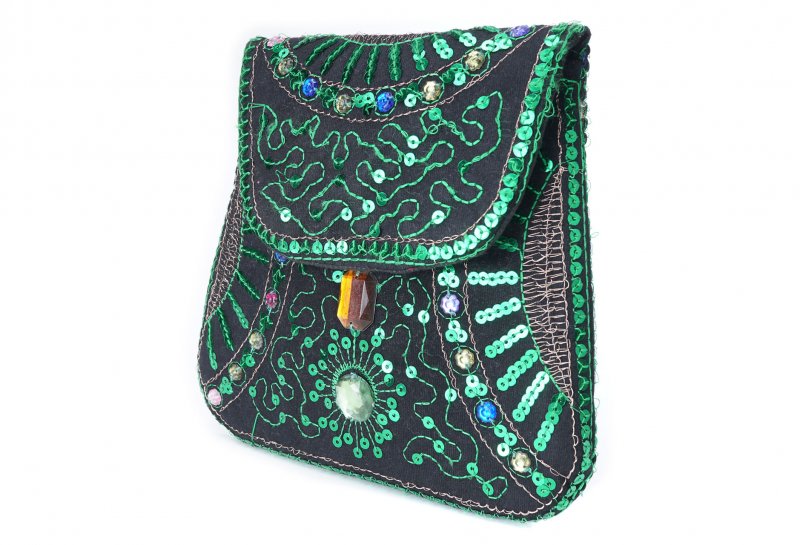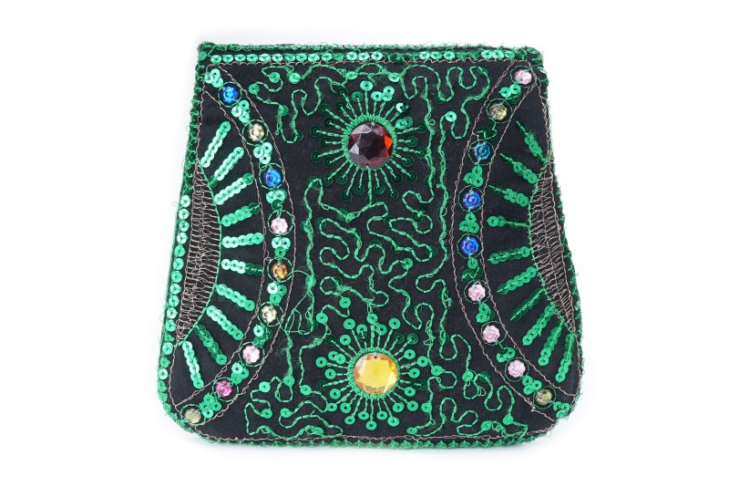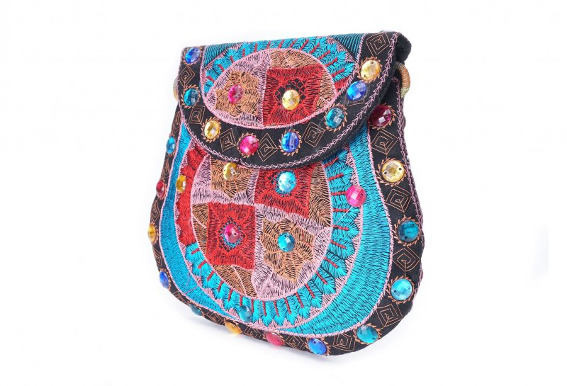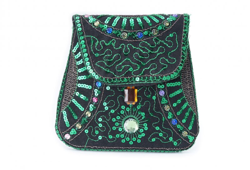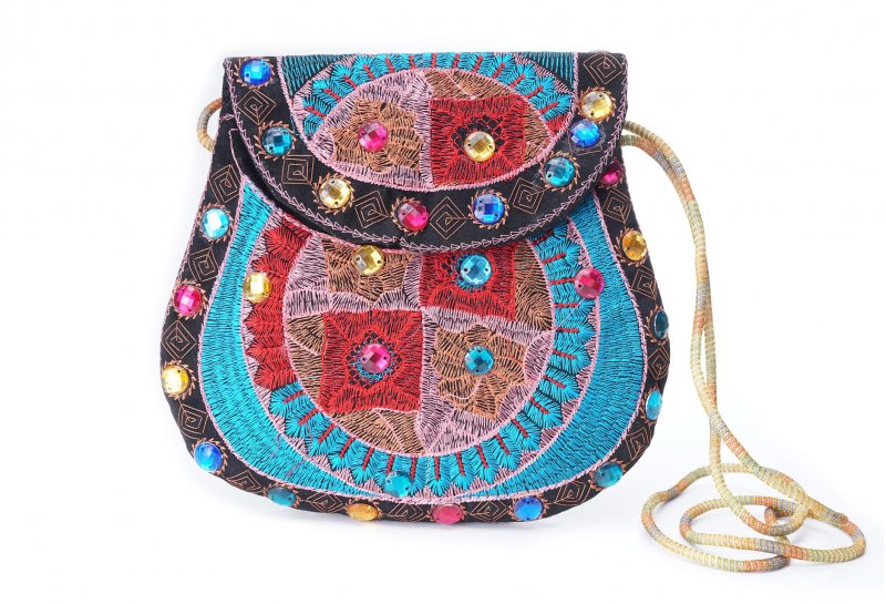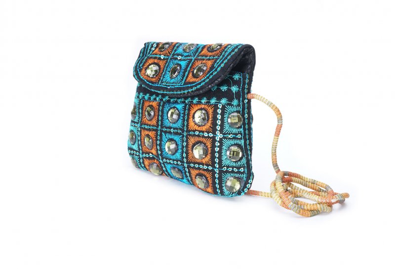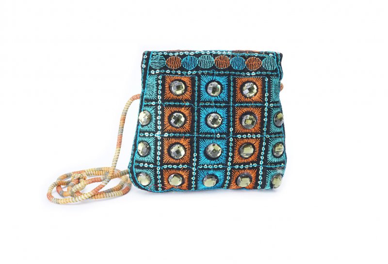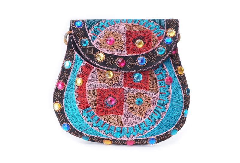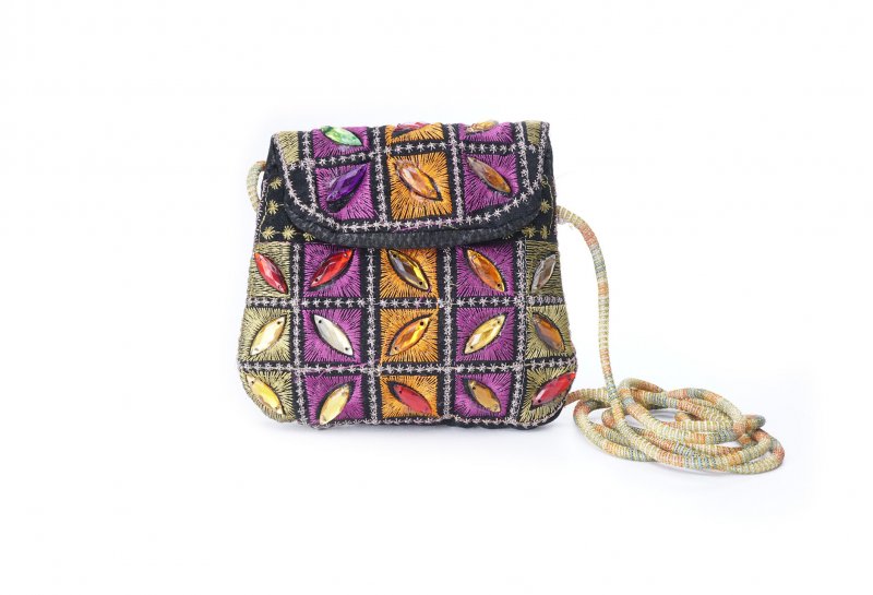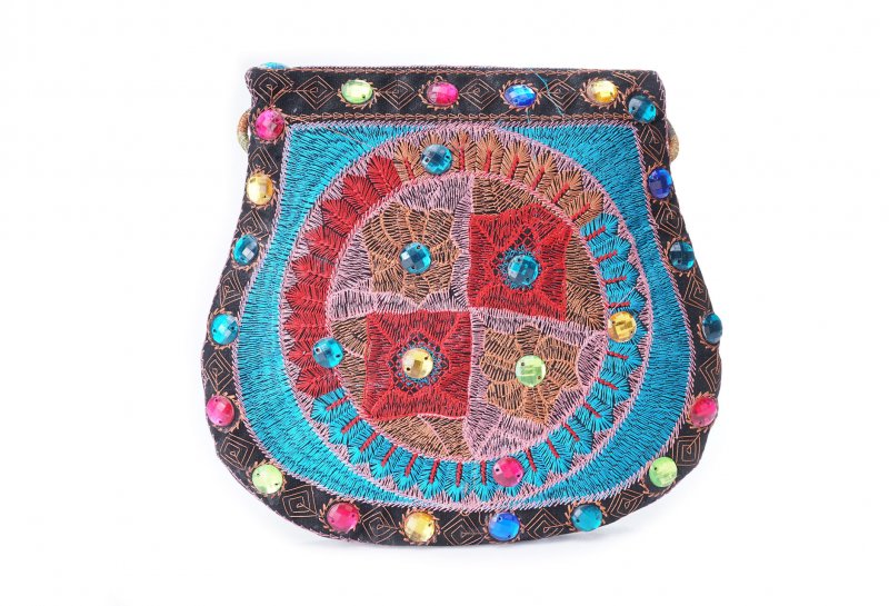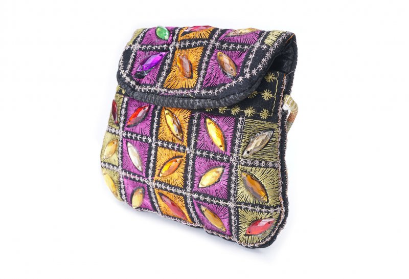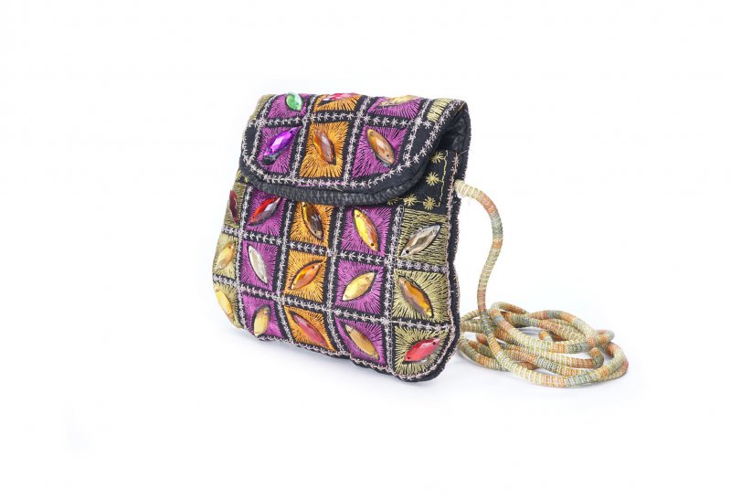 Özellikleri: Önde çıtçıt kapak, iç astarlı, ip askılı, renkli plastik boncuklu.