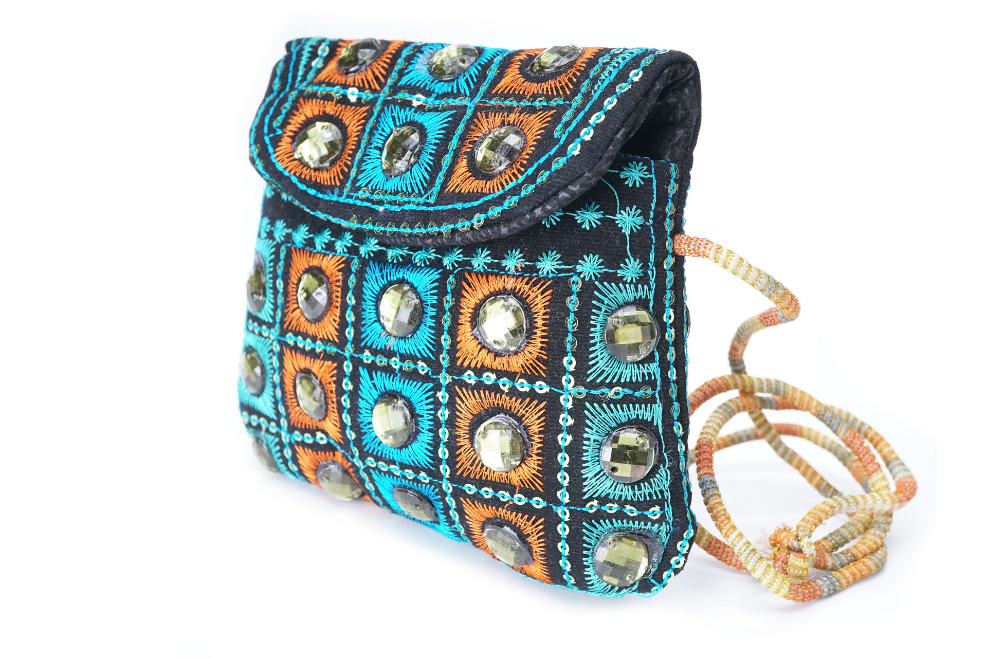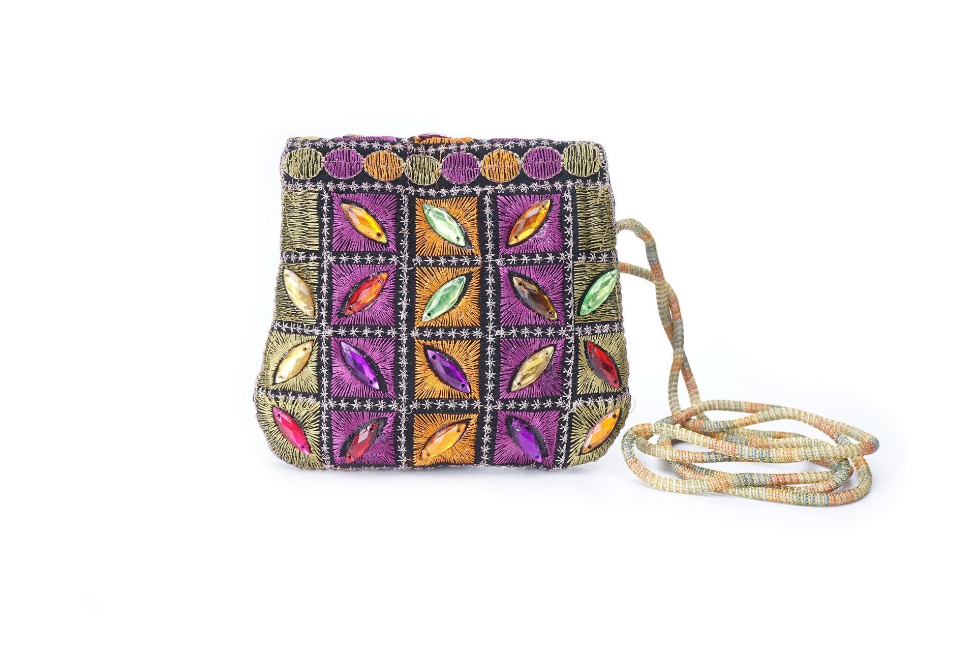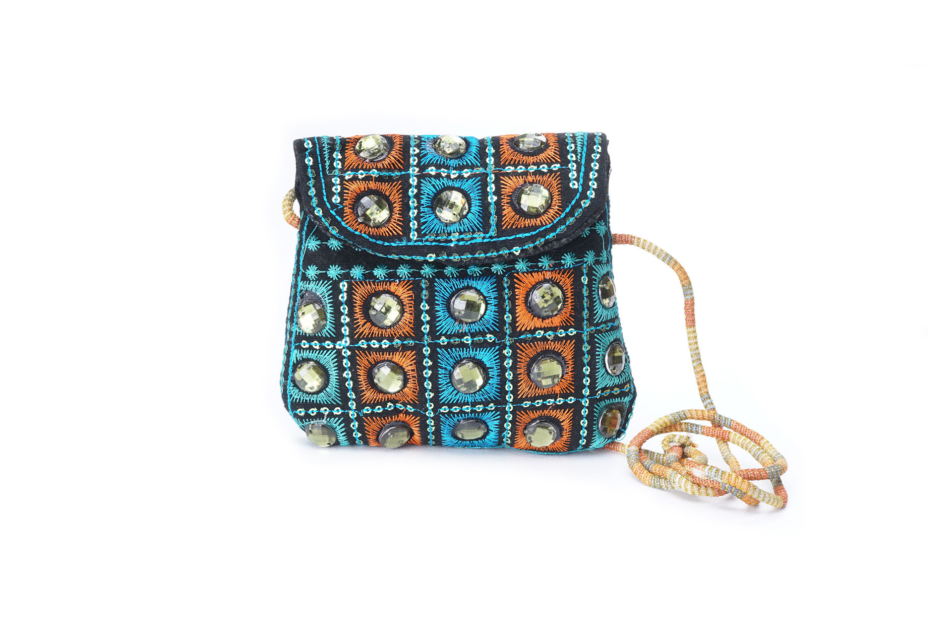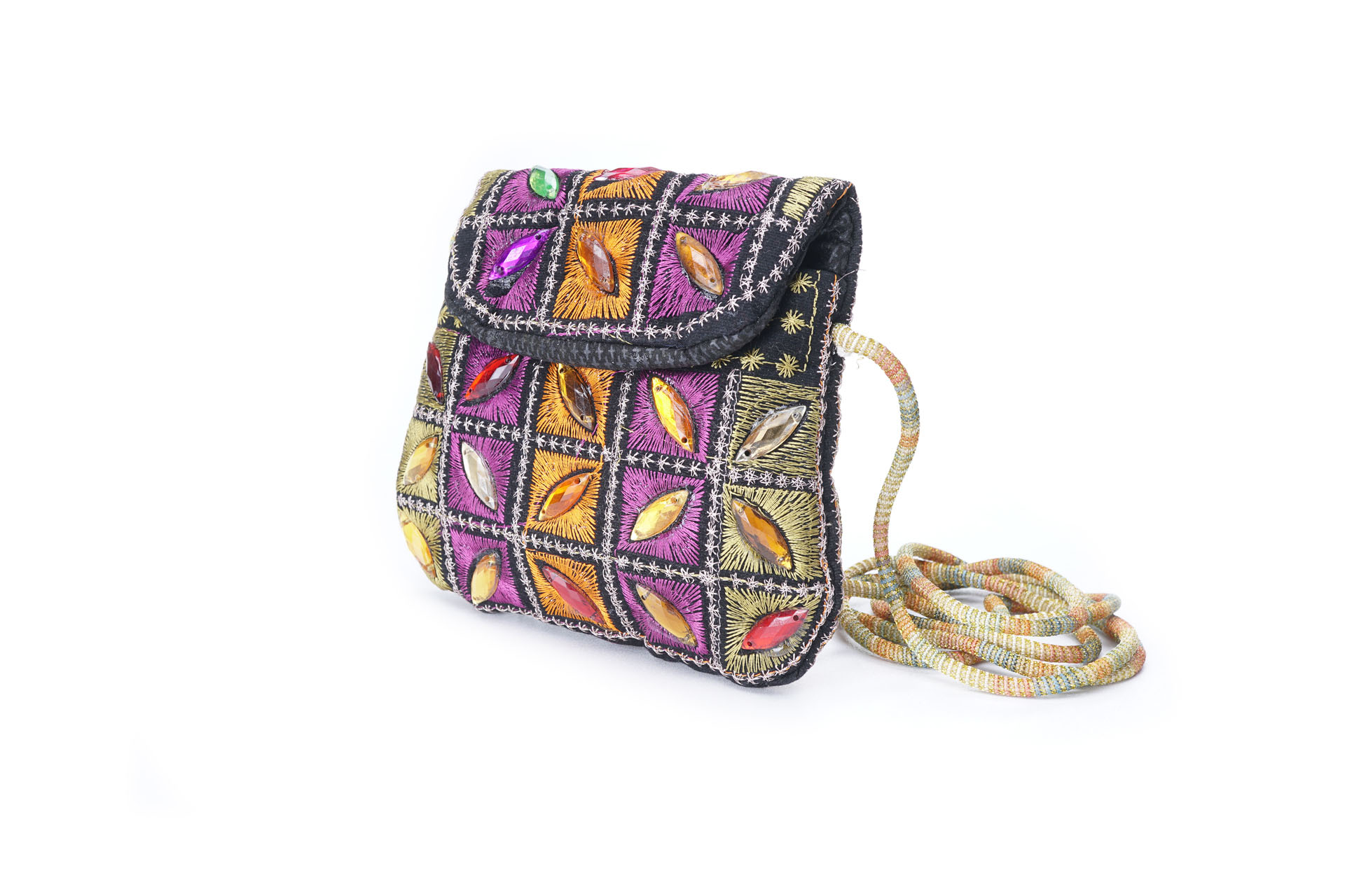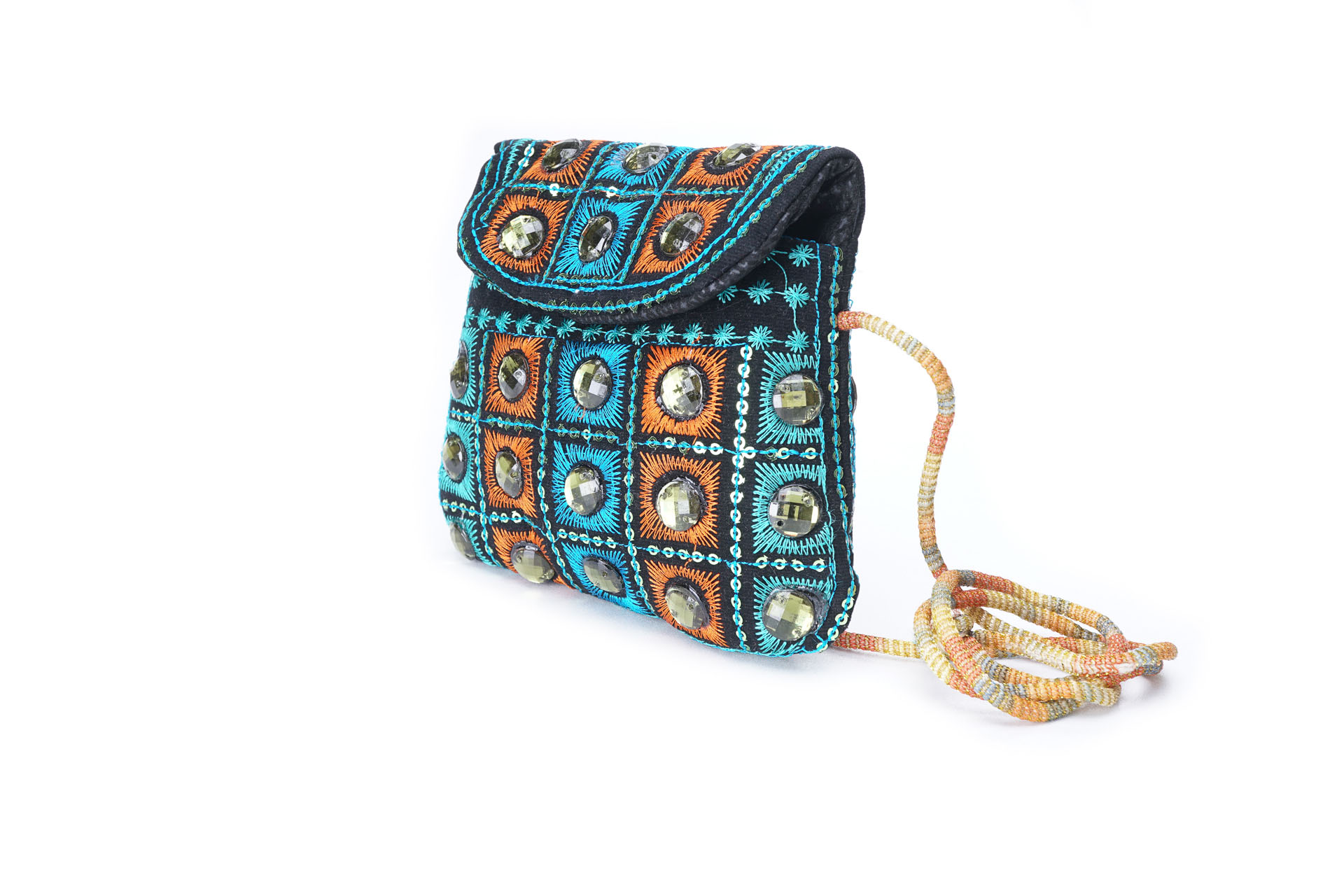 Özellikleri: Önde çıtçıt kapak, iç astarlı, ip askılı, renkli plastik boncuklu.