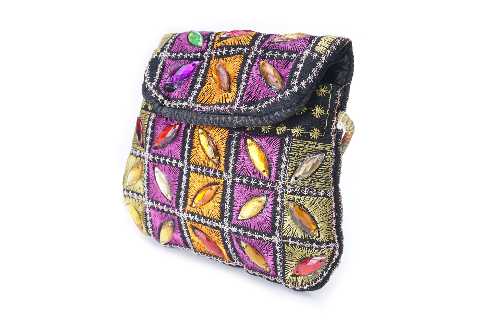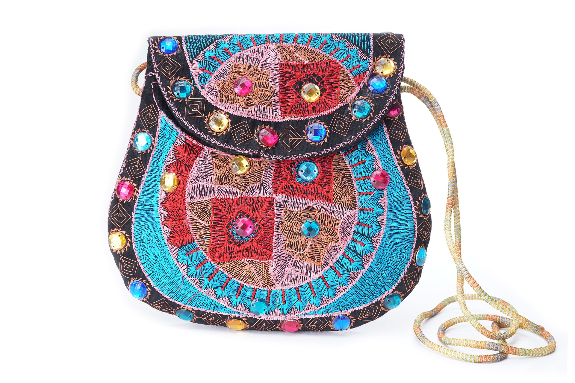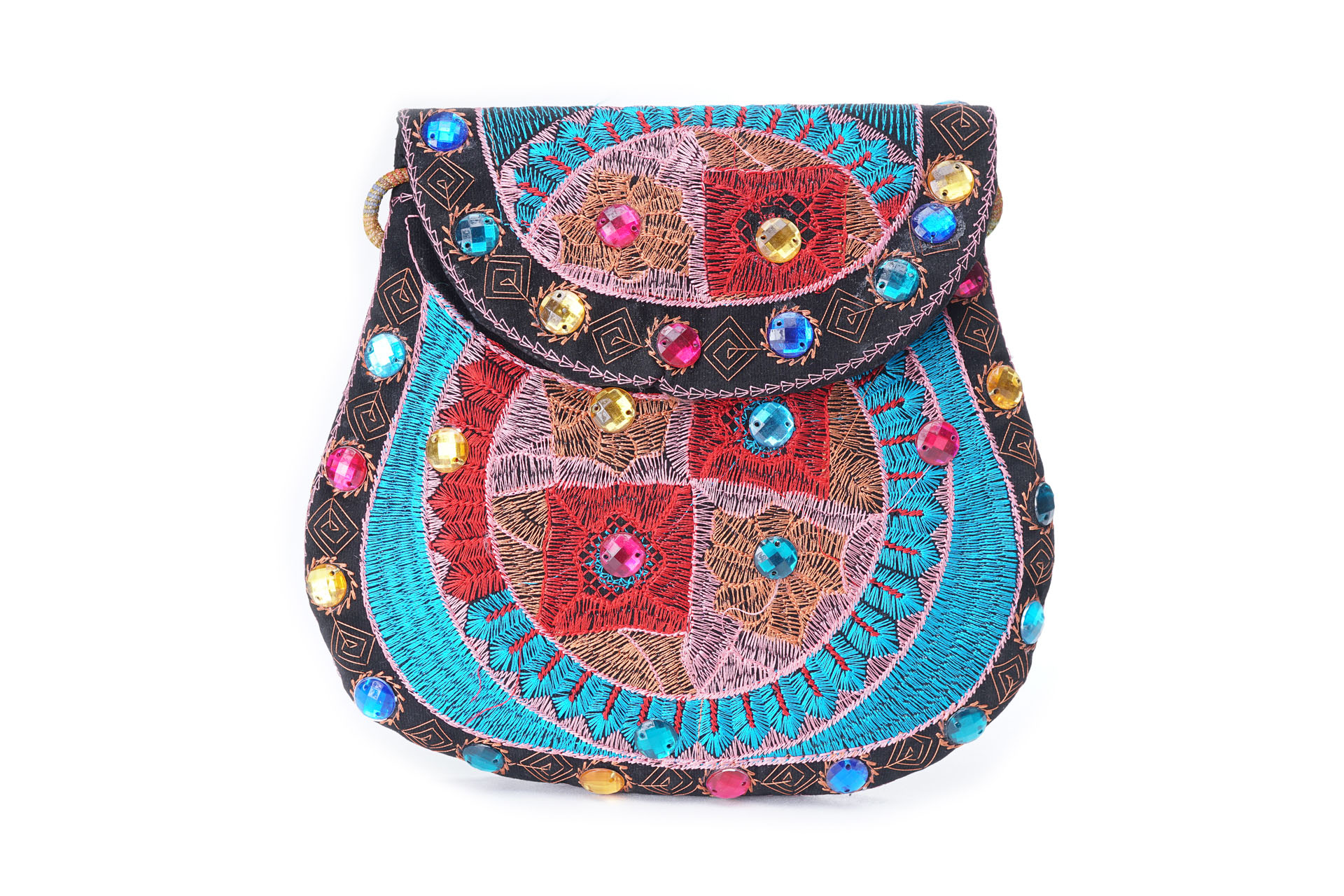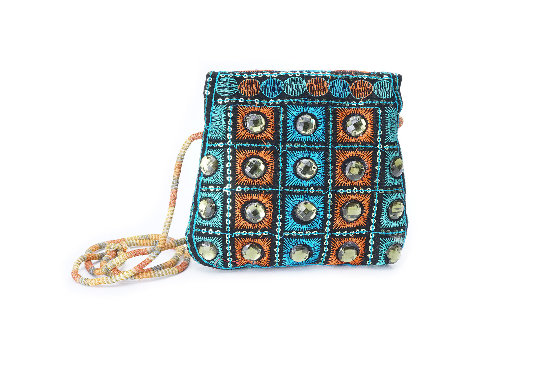 Özellikleri: Önde çıtçıt kapak, iç astarlı, ip askılı, renkli plastik boncuklu.