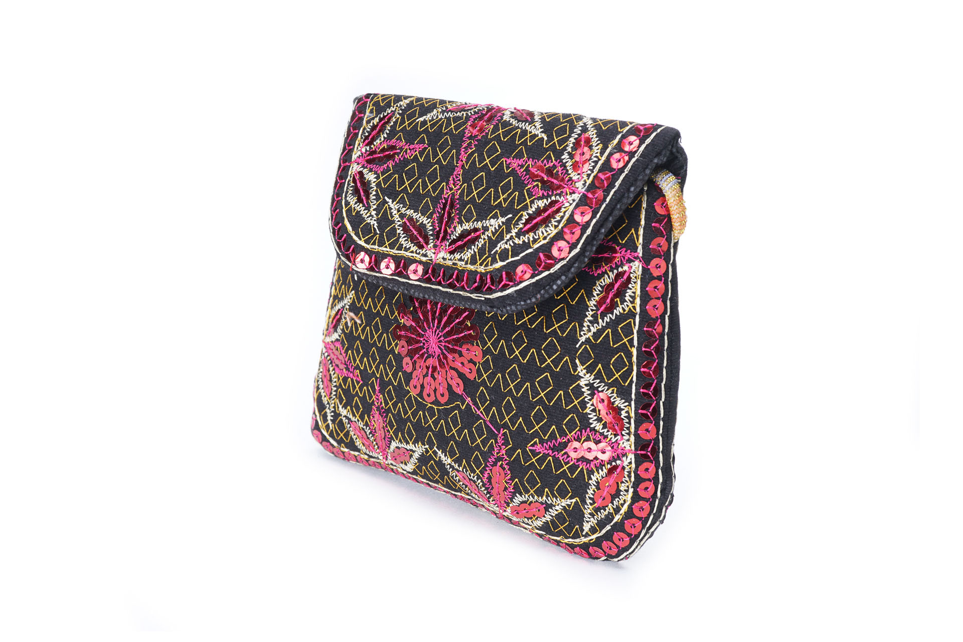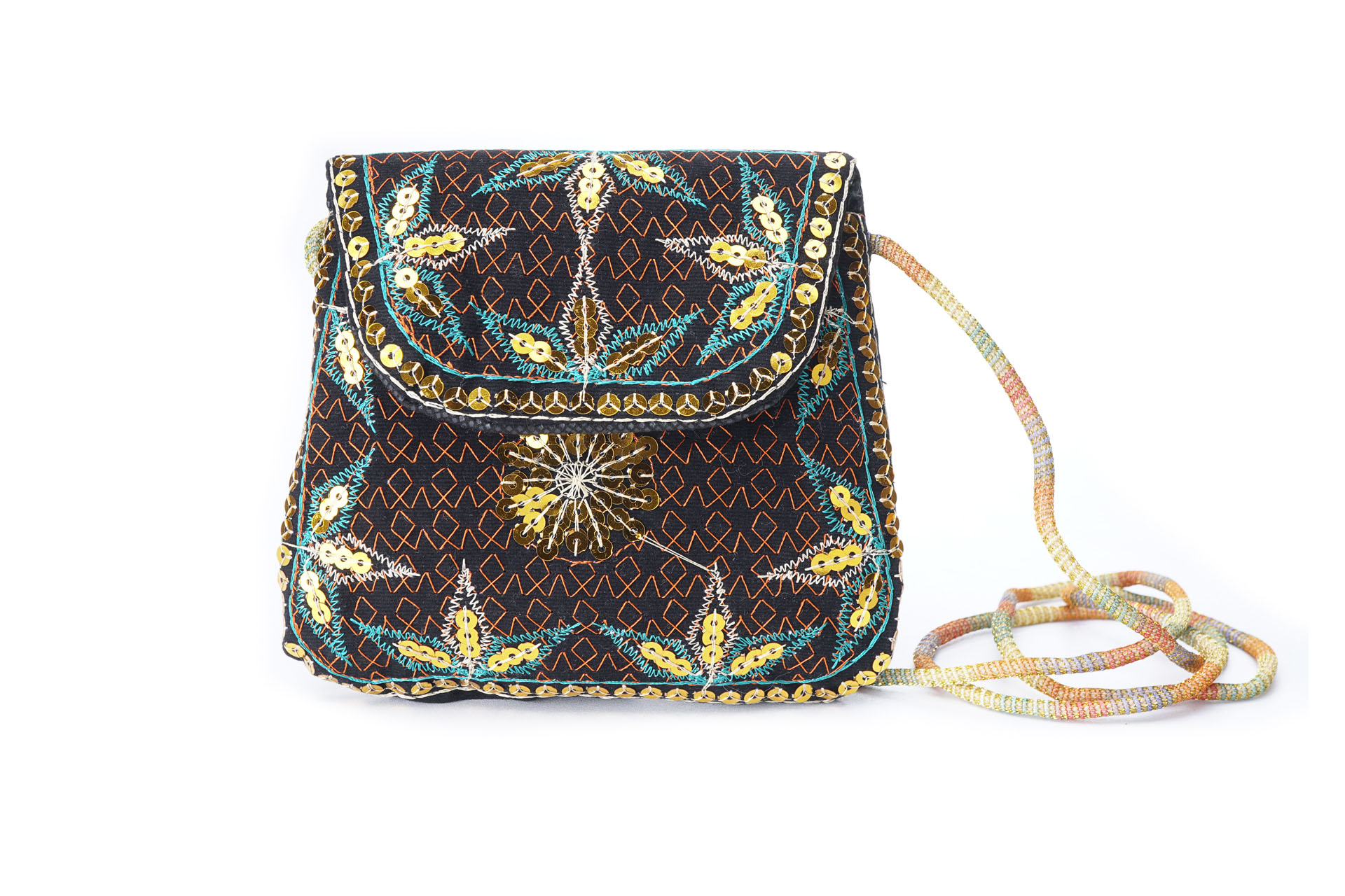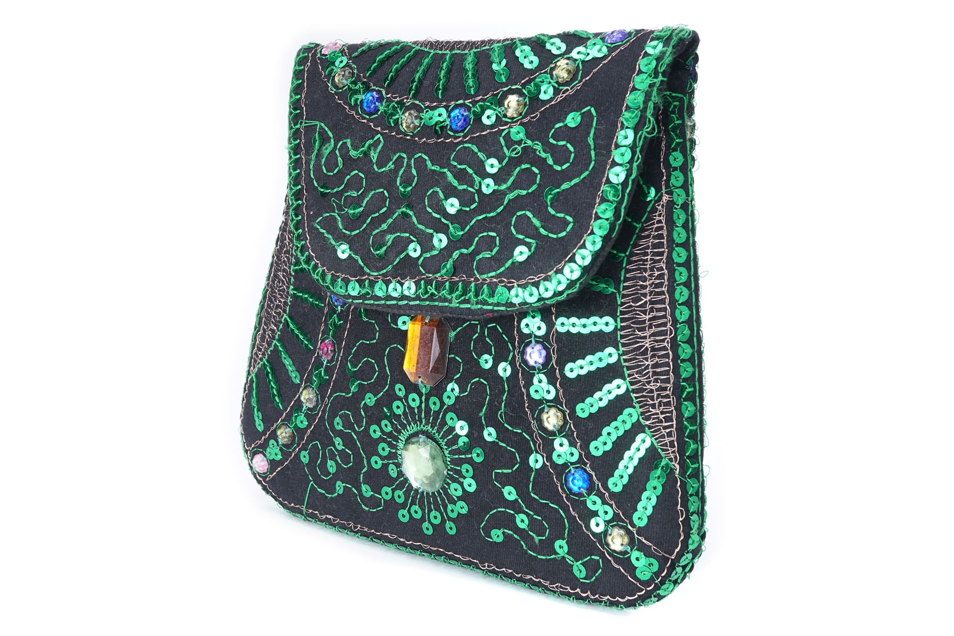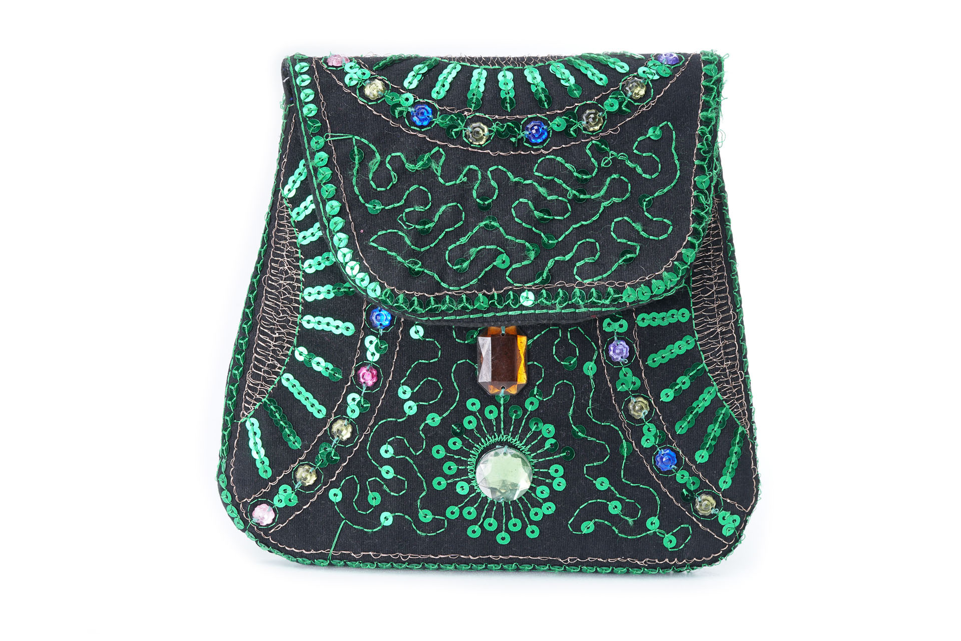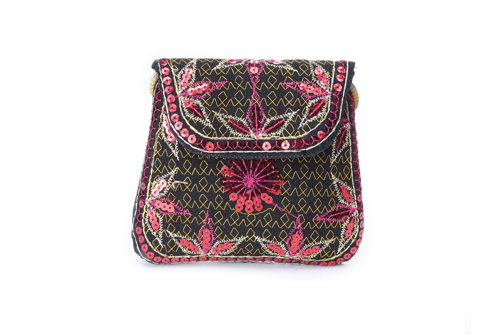 Özellikleri: Önde çıtçıt kapak, iç astarlı, ip askılı, renkli plastik boncuklu.