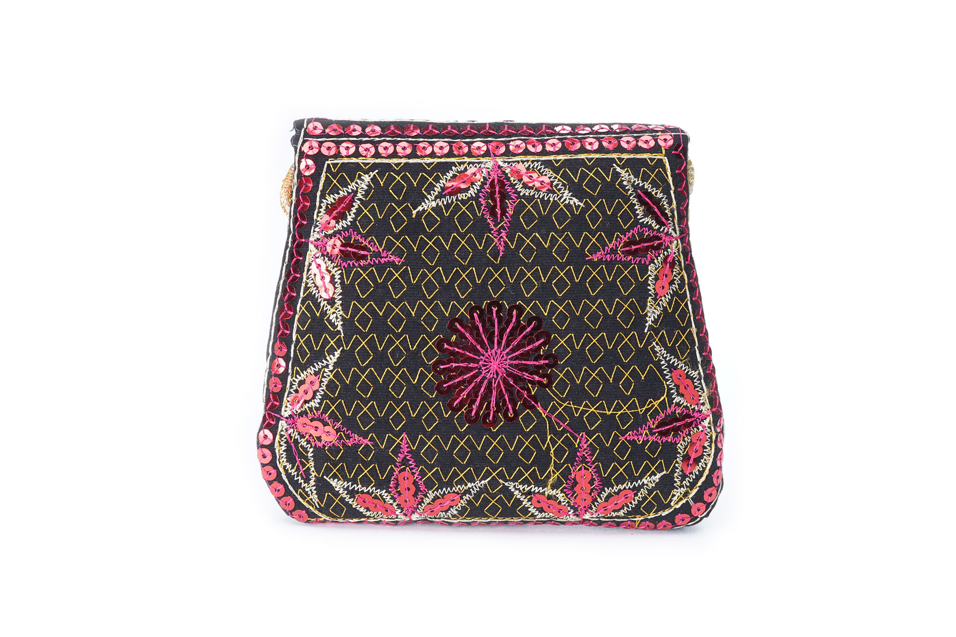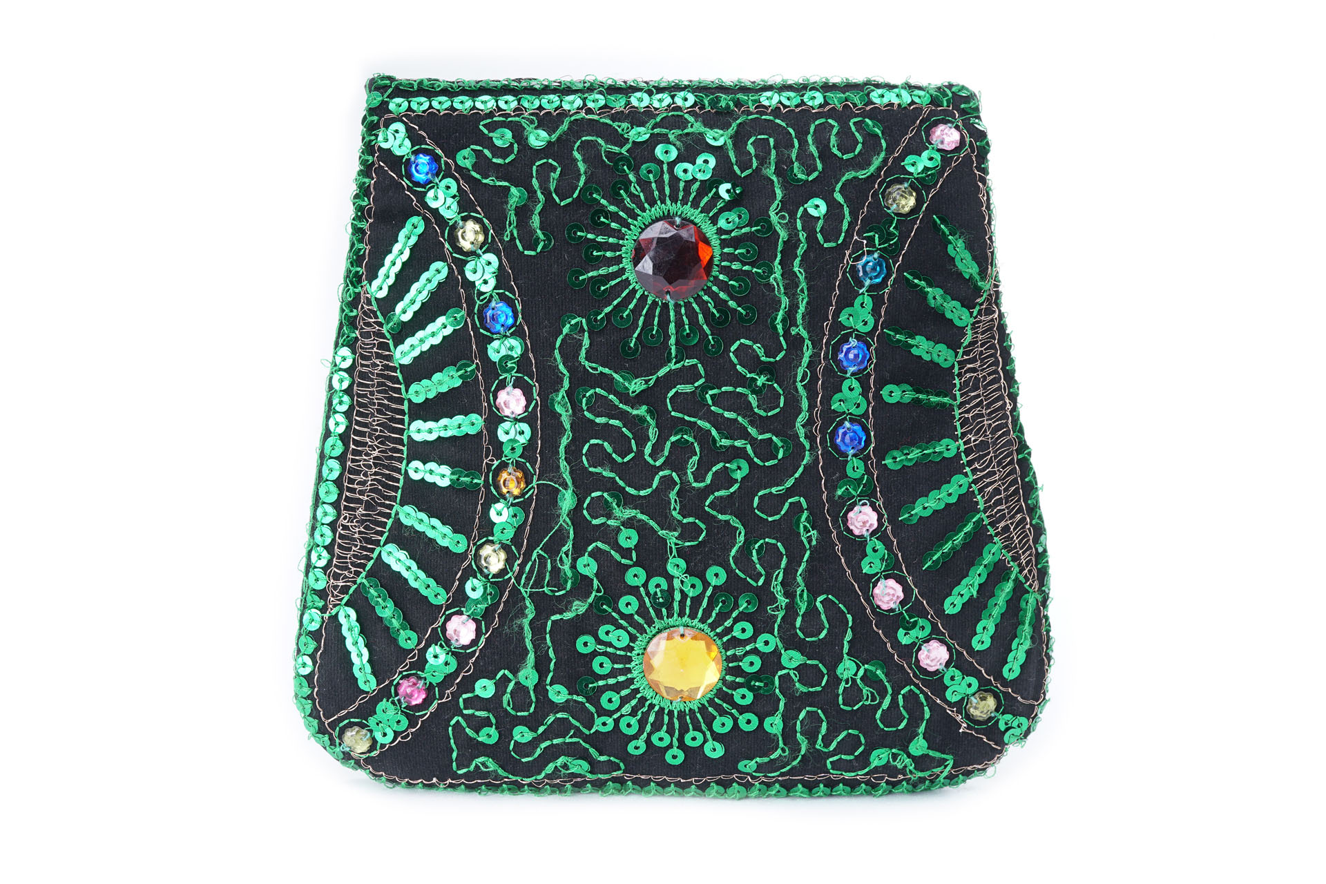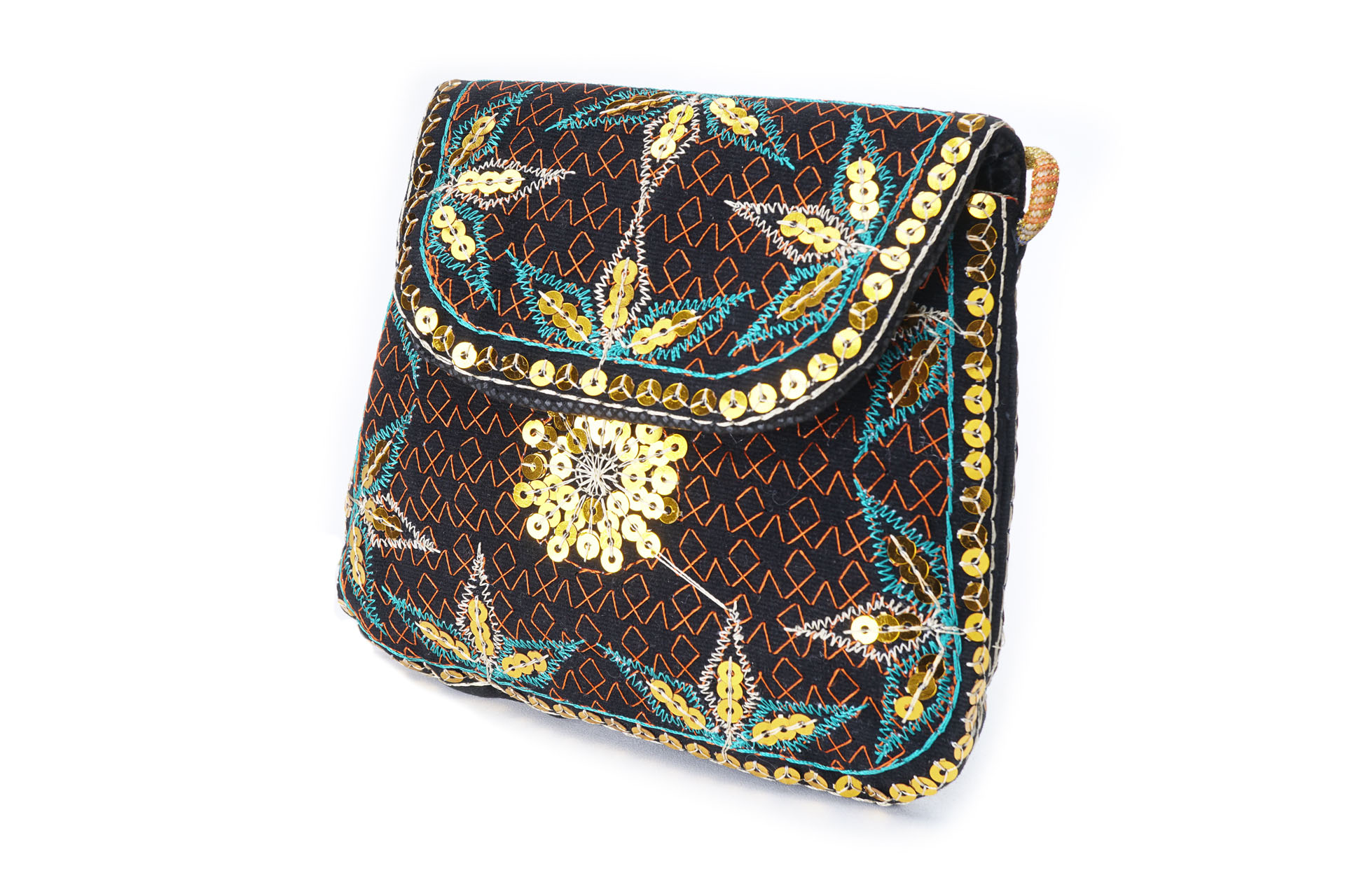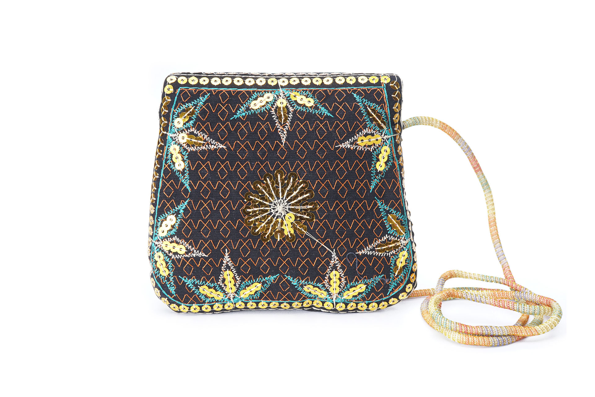 Özellikleri: Önde çıtçıt kapak, iç astarlı, ip askılı, renkli plastik boncuklu.